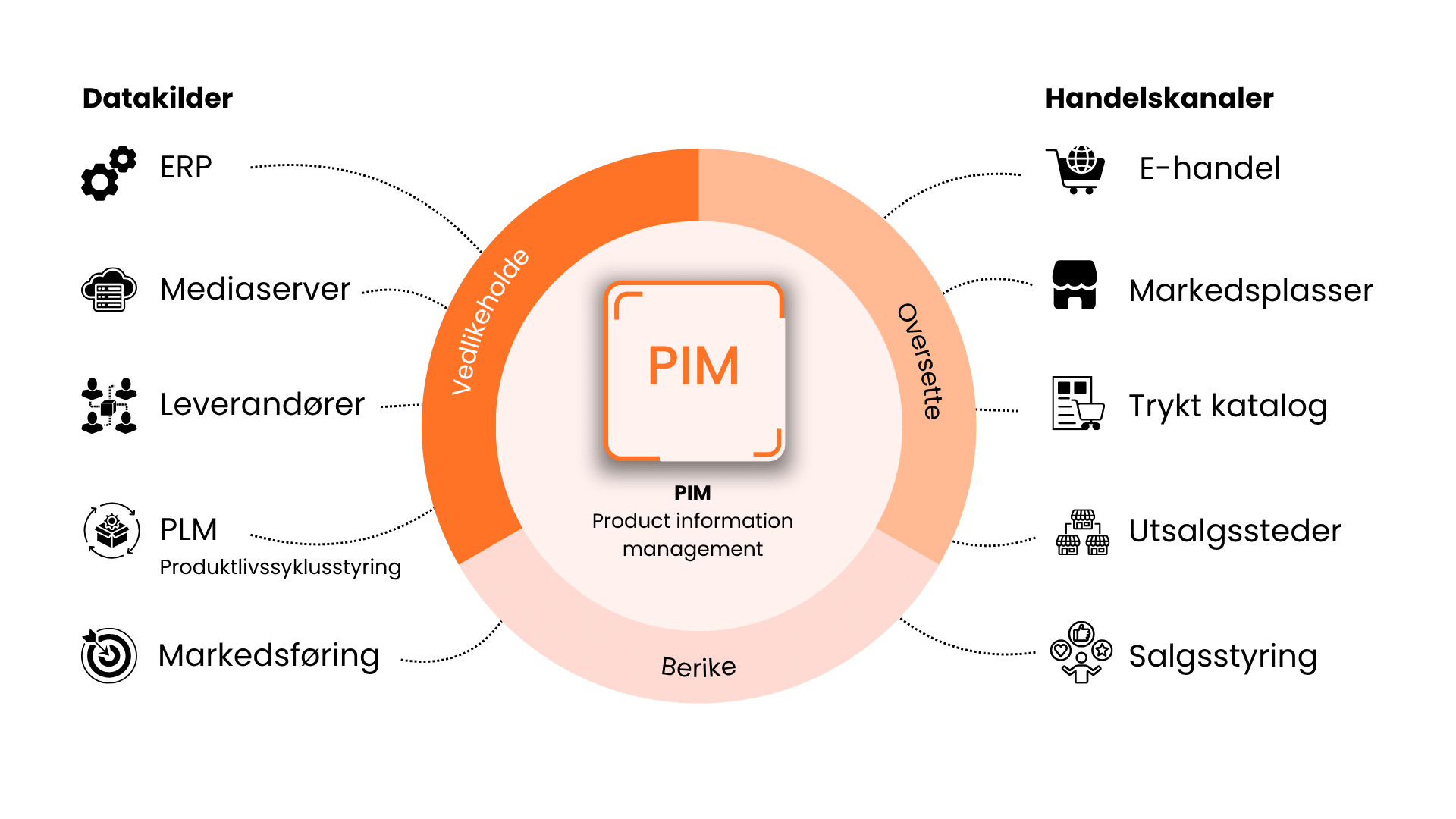 PIM: Masterdata for all kundeorientert produktinformasjon, inkludert beskrivelser, bilder, tekniske spesifikasjoner, salgspoeng, attributter og relasjoner.